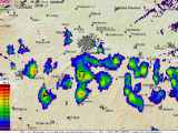 Radarový zoom s detekcí blesků CELDN z 25. 4. 2014 v 15:50 – 16:45 UTC. Křížek značí Přestavlky © Český hydrometeorologický ústav, Siemens AG, Vaisala Oyj Velikost: 2705.2 kB |