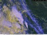 | Snímek z družice MSG v pseudoviditelném spektru barev zobrazující konvektivní bouře nad ČR. Křížek značí Unhošť. © Český hydrometeorologický ústav, EUMETSAT Velikost: 670.2 kB |