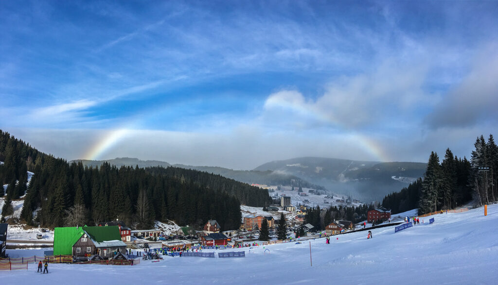 Odpoledne jsme již zamířili na sjezdovku a jen co jsme vyjeli na kopec, překvapil nás na severu fragment duhy, který postupně dorostl v celý oblouk. Nejspíš se jednalo o duhu oblačnou (cloud bow), která vzniká na hodně drobných kapičkách a je to takový přechod mezi duhou mlžnou a klasickou. Duha se tam držela značnou část odpoledne.