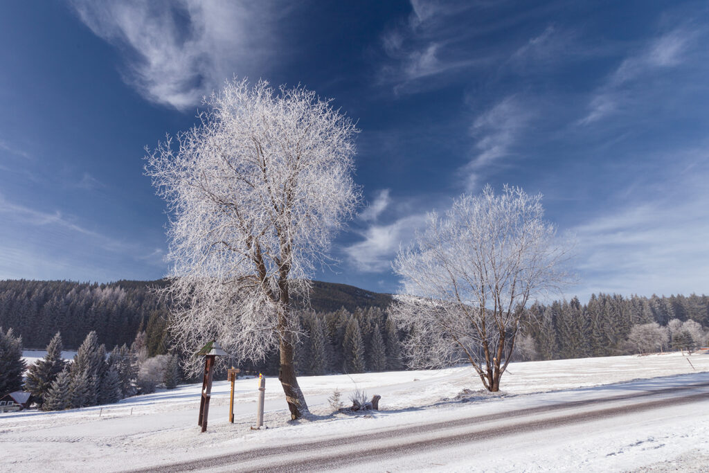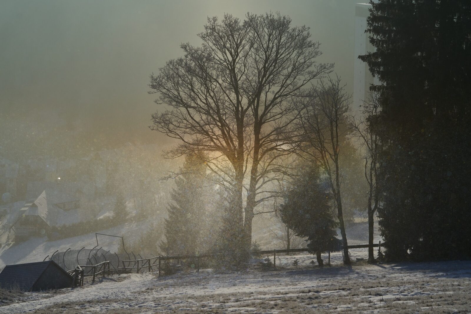 Chvíli jsme se motali na louce nad bobovou dráhou, vymýšleli jsme kompozice a čekali, jestli se na celém komplexu nerozsvítí ještě i něco jiného. Nicméně až na chvilkový fragment možná helického oblouku se tak nestalo. Mrak diamantů zeslábl a nad Pec se začala od severu natahovat cirrovitá oblačnost od severu před blížící se studenou frontou, která měla rozrušit inverzi a promíchat chladný vzduch v údolí s teplejším na kopcích. Prozatím ale teploty zde zůstávaly pod nulou, a tak jsme si ještě dali malou procházku, abychom si užili alespoň ojíněné stromy, které dodávaly krajině alespoň trochu zimní ráz.