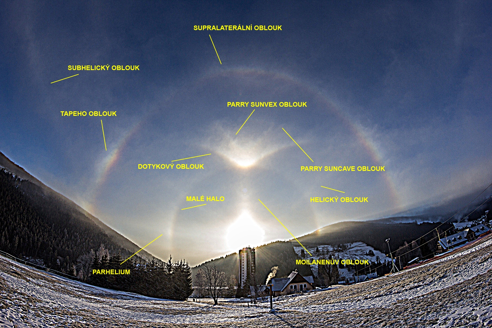 Nicméně na druhé straně to také nezahálelo a postupně se kromě malého hala rozsvítily další jevy jako parhelia, supralaterální oblouk možná i s velkým 46°halem, horní dotykový oblouk, Parry sunvex i suncave a chvílemi byl vidět i Moilanen. Jedniné co jsem postrádala, byl cirkumzenitální oblouk, který dokáže být na diamantech úchvatně zářivý.