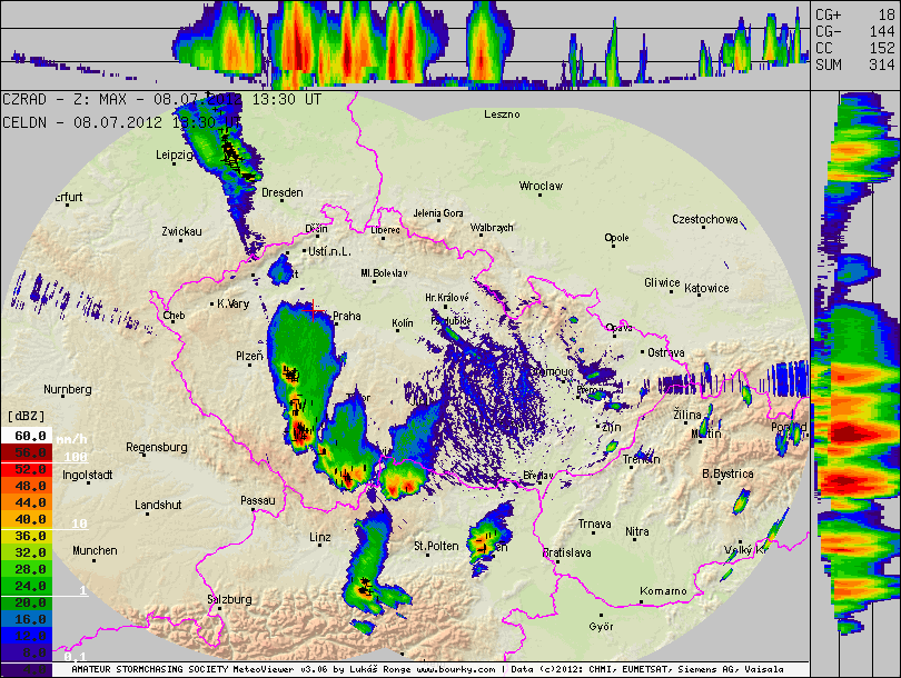 Netrvalo dlouho a měla jsem opět na drátě Tomáše, tentokrát že pozoruje luxusní blýskavici. Zabrousila jsem opět na radar, abych zjistila, že tentokrát není Tomášovou favoritkou ona pěkná bouřka na severu, která byla již touto dobou skoro po smrti, ale další poměrně vydařená buňka, která právě řádila kdesi na hranici mezi Polskem a Jeseníky – od nás cca 230 km vzdušnou čarou. Že tam skutečně „pěkně řezalo“ mě následně nezapomínal nadšeně informovat ani Zbyněk, který ji u Opavy sledoval z daleko větší blízkosti.