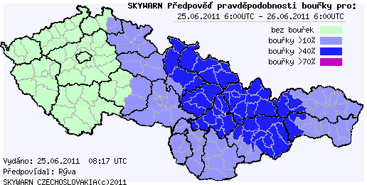 Nejvhodnější podmínky předpovědi naznačují pro S-SV Moravu a Z-SZ Slovenska. V rámci Slovenska se pak modely úplně neshodují v lokalizaci oblastí s labilitou a výskytem konvektivních srážek. S ohledem na výše zmíněné skutečnosti vydáváme základní nultý stupeň na výskyt bouřek pro část Moravy ale i celé Slovensko, kde díky určité nejistotě v lokalizace necháváme na většine území pouze 10% pravděpodobnost bouřky. Oblasti, které se za současné situace jeví jako nejnadějnější pro výskyt bouřek, jsou vyznačeny pravděpodobností nad 40%.