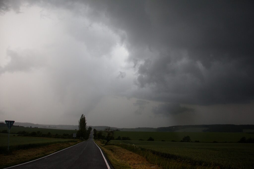 Rychle spěchám domu pro auto a mířím zase blíže k bouři. Dostávám se k ní u Malíkovic, kde si všimnu trychtýře až na zem v místě, kde by se učebnicově mělo tornádo vytvořit. Záhy mi volá Honza se stejnou myšlenkou. Rychle cvaknu pár fotek a zase jedu o pár kilometrů blíže, kde už se ale útvar rozpadá a začíná silněji pršet. V tom spěchu jsem neměl čas pozorovat rotaci útvaru, ale to naštěstí pěkně dokumentuje Honza.