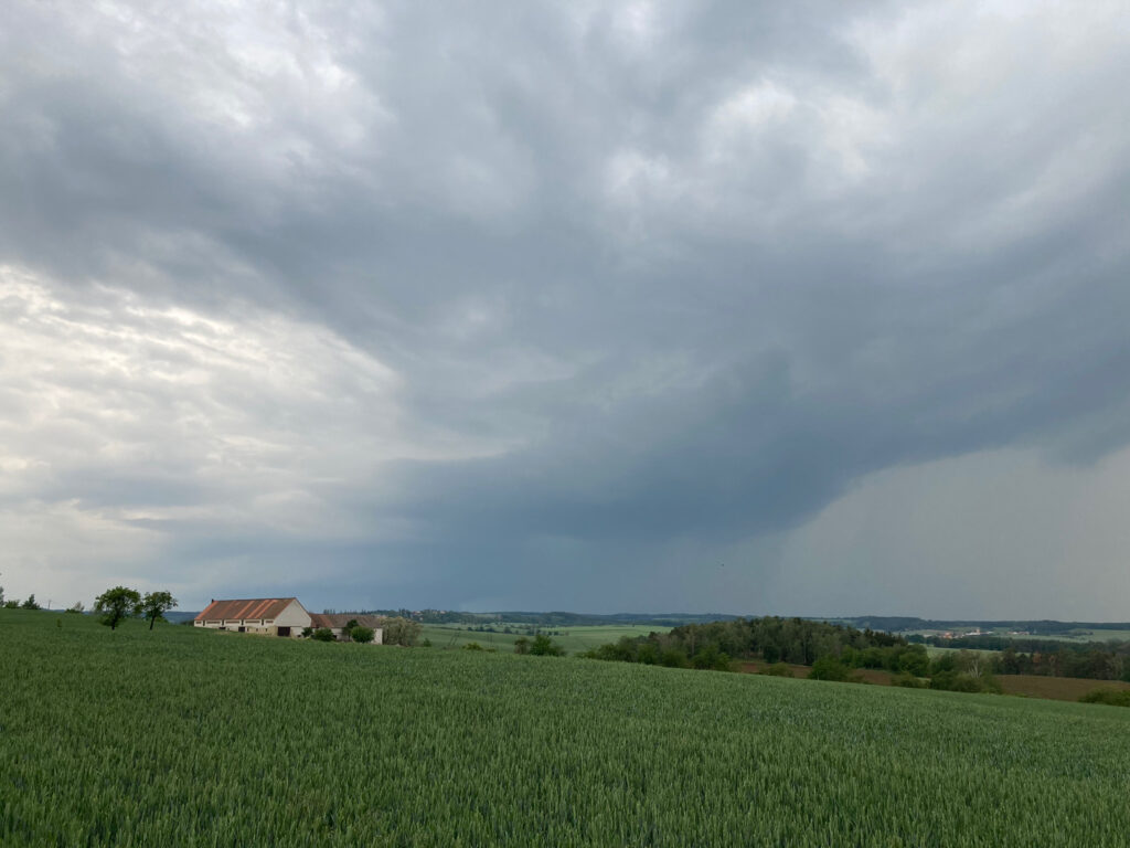 K mému překvapení bouřka už vypadala velmi zajímavě. Na jižní straně byl docela zřetelný wall-cloud, nad ním oblast výstupních proudů v provedení, které je typické pro supercelu a v severní části bouřky bylo rozsáhlé a silné srážkové pole – občas s bleskem či hromem. Po krátké konzultaci s Honzou jsem se opět pustil do focení této nevšední bouřky a za chvíli mně upoutala ještě další věc. Pod základnou wall-cloudu se kromě jiných oblačných chuchvalců objevil nápadný kuželovitý útvar, jehož pomyslný hrot dosahoval (z mého pohledu) až k zemi. Že by snad tornádo? Nejprve jsem udělal několik detailních fotek a potom pozoroval další podrobnosti, které by pomohly určit, o co se jedná. Rotace vidět nebyla a zřetelný funnel-cloud také ne. Ještě jsem chvíli útvar pozoroval, ale nic se na tom příliš nezměnilo a postupně nastal jeho rozpad. Ani tak v tuto chvíli nelze vyloučit, že rotace ve středu kužele nebo pod ním mohla být dostatečně silná, aby způsobila nějaké škody – třeba na porostu.