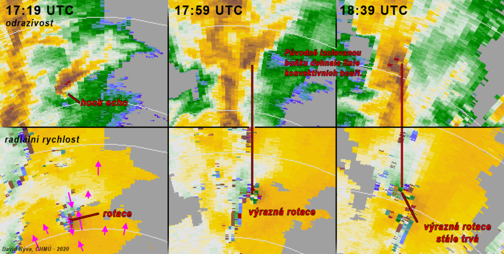 Radarová animace ČHMÚ v rozmezí 18:00 až 21:30 SELČ zobrazující celkovou situaci. Sledovaná bouře vznikla severně od Plzně a postupovala k SV před samotnou linií konvekce, se kterou kolem 20:00 začala splývat. Přesto si i nadále zachovala rotaci, což nejspíš mohlo mít za následek intenzivnější projevy a způsobené škody v trase bouře.