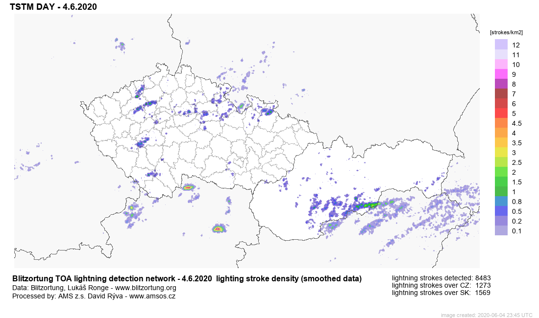 Denní sumace detekce blesků ze sítě Blitzortung.org zobrazující hustotu výbojů na kilometr čtvereční. Opět je možné vidět pás námi sledované bouře.