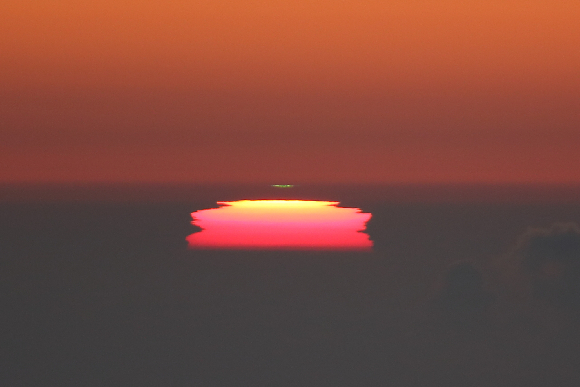 Pokud je výrazný teplotní, tím pádem i hustotní přechod v tenké vrstvě vzduchu (třeba i víc než 10°C v tloušťce vzduchu několika desítek metrů), můžeme se těšit na optické jevy, jako je zelený záblesk nebo svrchní zrcadlení. Obecně se udává, že zelený záblesk vzniká na pár vteřin při východu/západu slunce v mimořádně čistém (a suchém) vzduchu, kdy se bílé sluneční světlo při obzoru nejvíce rozkládá podobně jako přes optický hranol. Teoreticky lze spatřit i modrý záblesk, tato barva je ale více rozptylována než zelená a je to mnohem vzácnější jev. Zelené záblesky jsem však pozoroval i ve vzduchu o vlhkosti víc než 70% a někdy i skrze vysokou oblačnost. Podle mého pozorování má hlavní vliv na pozorování zeleného záblesku výskyt vrstev vzduchu s rozdílnou hustotou (inverze), na kterých dochází k lomu světla a zároveň i k zrcadlení. Takže někdy je obtížné říct, jestli jsou první paprsky slunce už východem slunce nebo se jedná zatím jen o zrcadlení. Pokud se podíváme na některé fotky zeleného záblesku (viz níže), tak lze konstatovat, že kolikrát je deformovaný kotouč slunce (zubatý okraj), tak tolik je hustotních přechodů. Zelený záblesk se vytvoří zřejmě na tom nejvýraznějším, ale může jich být i více během jednoho východu/západu slunce.