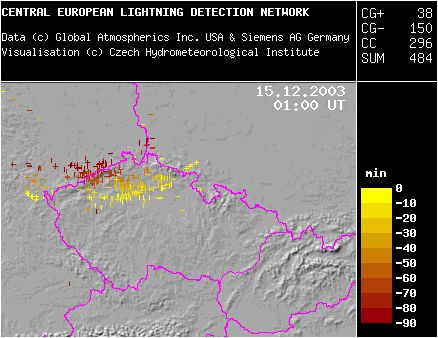 Situace z 15. 12. 2003 ve 2:00. Za poskytnutí snímku děkujeme ČHMÚ.